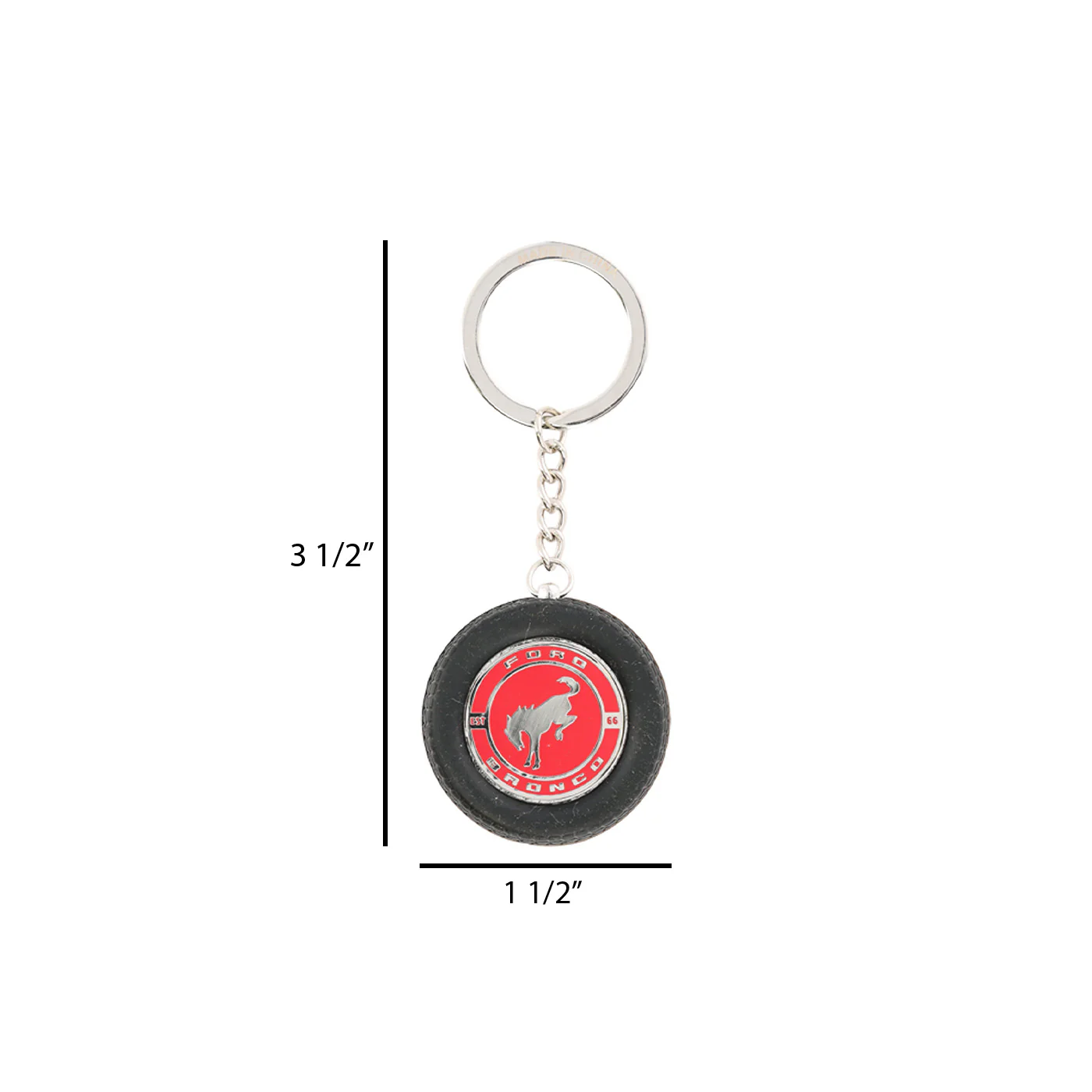 Celebrate six decades of Bronco adventure with this fun and detailed Bronco Tire Key Chain! Made from sturdy zinc alloy metal and featuring a rubberized tire. This key holder is built to roll with you wherever you go. The spinning Bronco wheel measures 40mm. The 35mm key holder makes it easy to clip onto your backpack. Sized just right at 3.5 inches tall, 1.5 inches long, it’s a charming way to show your Bronco pride. When it gets a little dirty from your adventures, just give it a quick wipe with a damp cloth to keep it ready to ride!