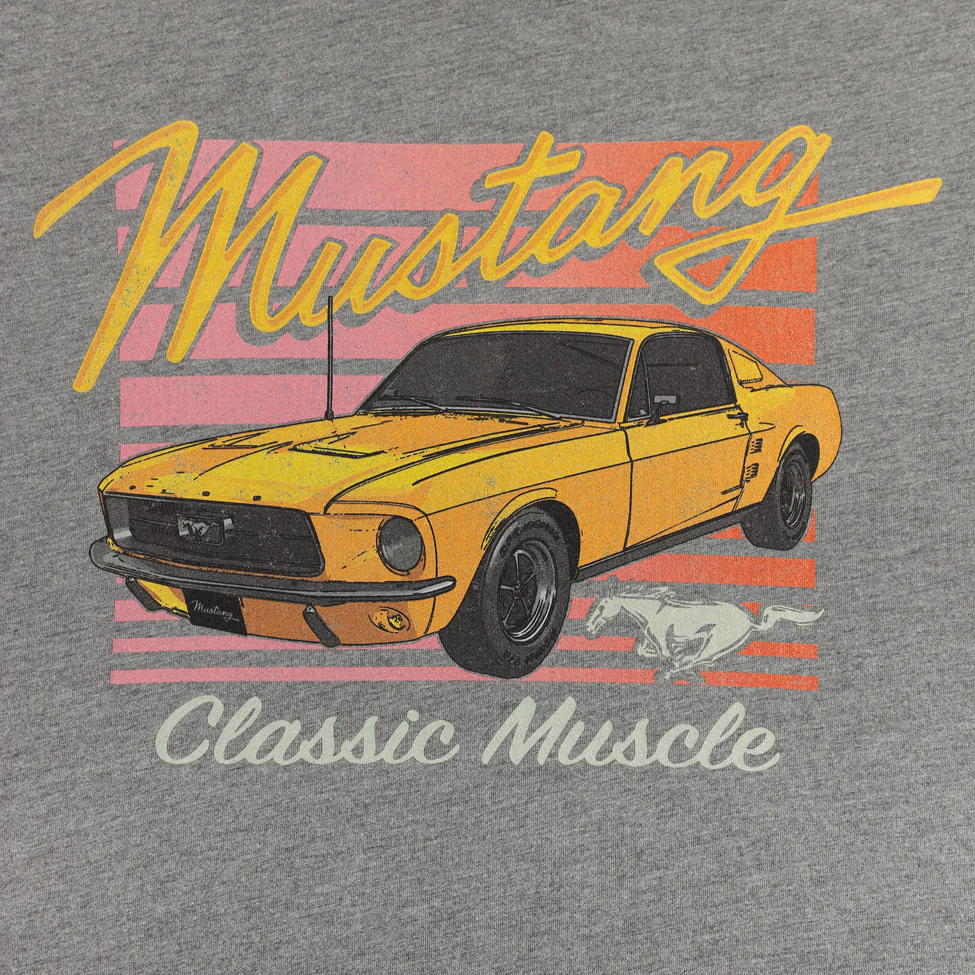 This Ford Mustang t-shirt channels that bold legacy with a graphic that screams vintage Mustang attitude. Designed to keep you cool and looking fierce, this charcoal short-sleeve tee is your go-to for any adventure. Built with a rib-knit neck, shoulder taping, and side seams for a sharp fit, it’s also carbon footprint neutralized through the ClimeCo Certified Product™ Program. Ready to make a statement? The front graphic displays vintage yellow Mustang text and a Mustang vehicle with a pink and orange striped background. Follow simple care instructions and wear your Mustang pride loud and proud on this Ford Mustang mens t-shirt.