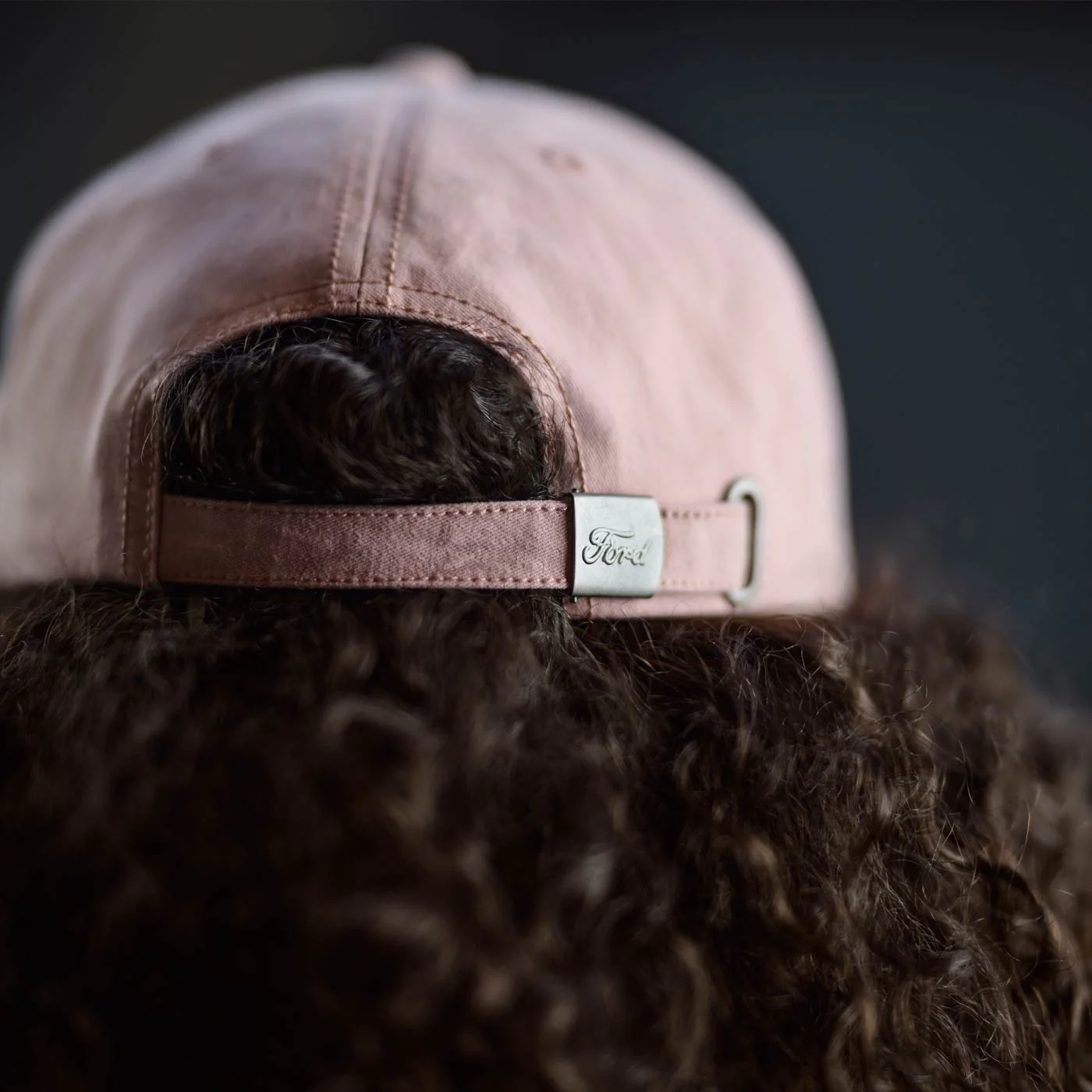 Drive or ride in style with the Ford Script womens hat in playful pink! This 100% cotton cap features an adjustable slideback strap for the perfect fit. Show off the crisp white embroidered Ford Script and a cool Ford detail on the metal closure. To keep this hat road-ready, hand-wash it on a cold, gentle cycle with like colors. Lay it flat to dry.